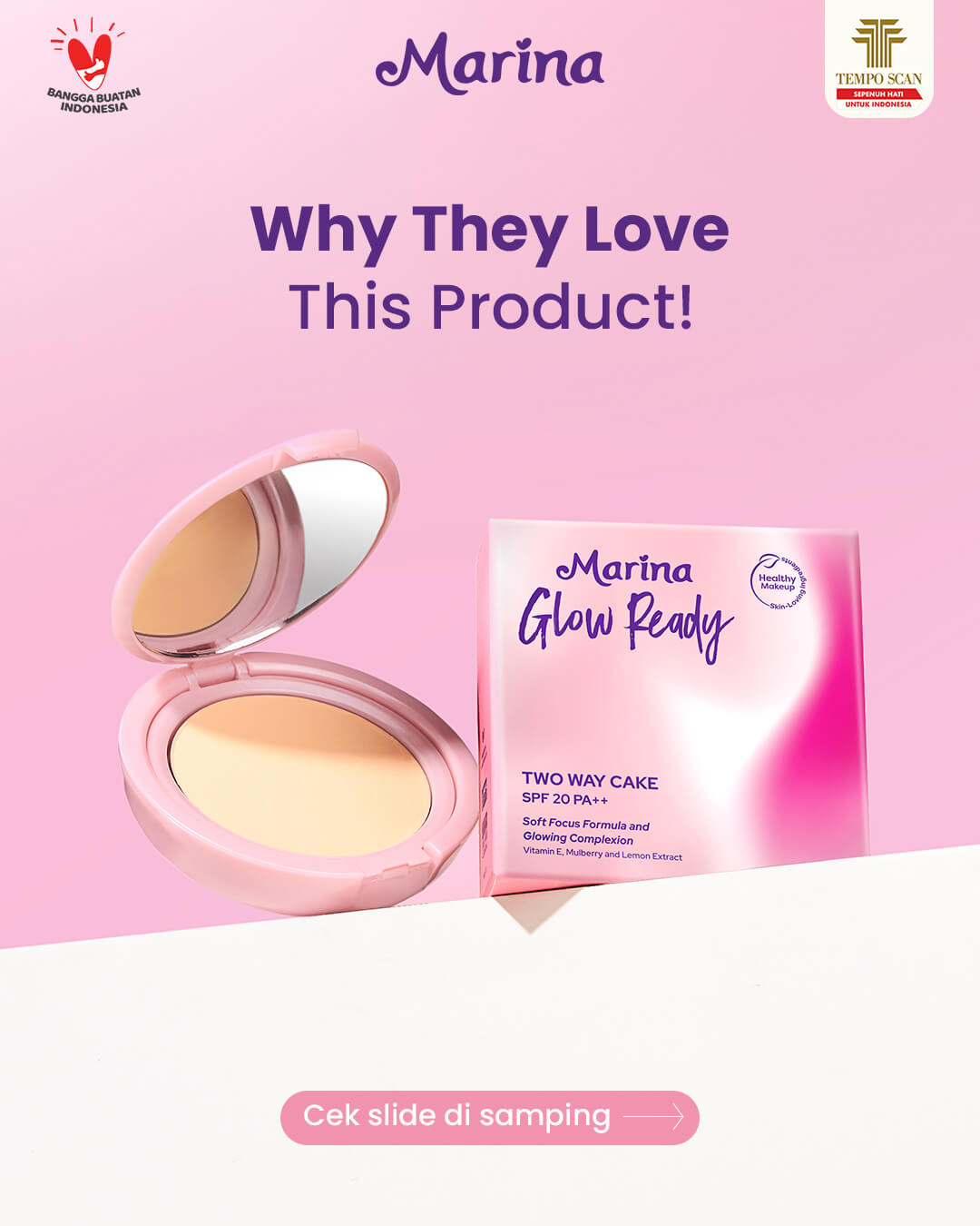 Two Way Cake dengan formula ringan yang membuat wajah tampak halus & bersinar.