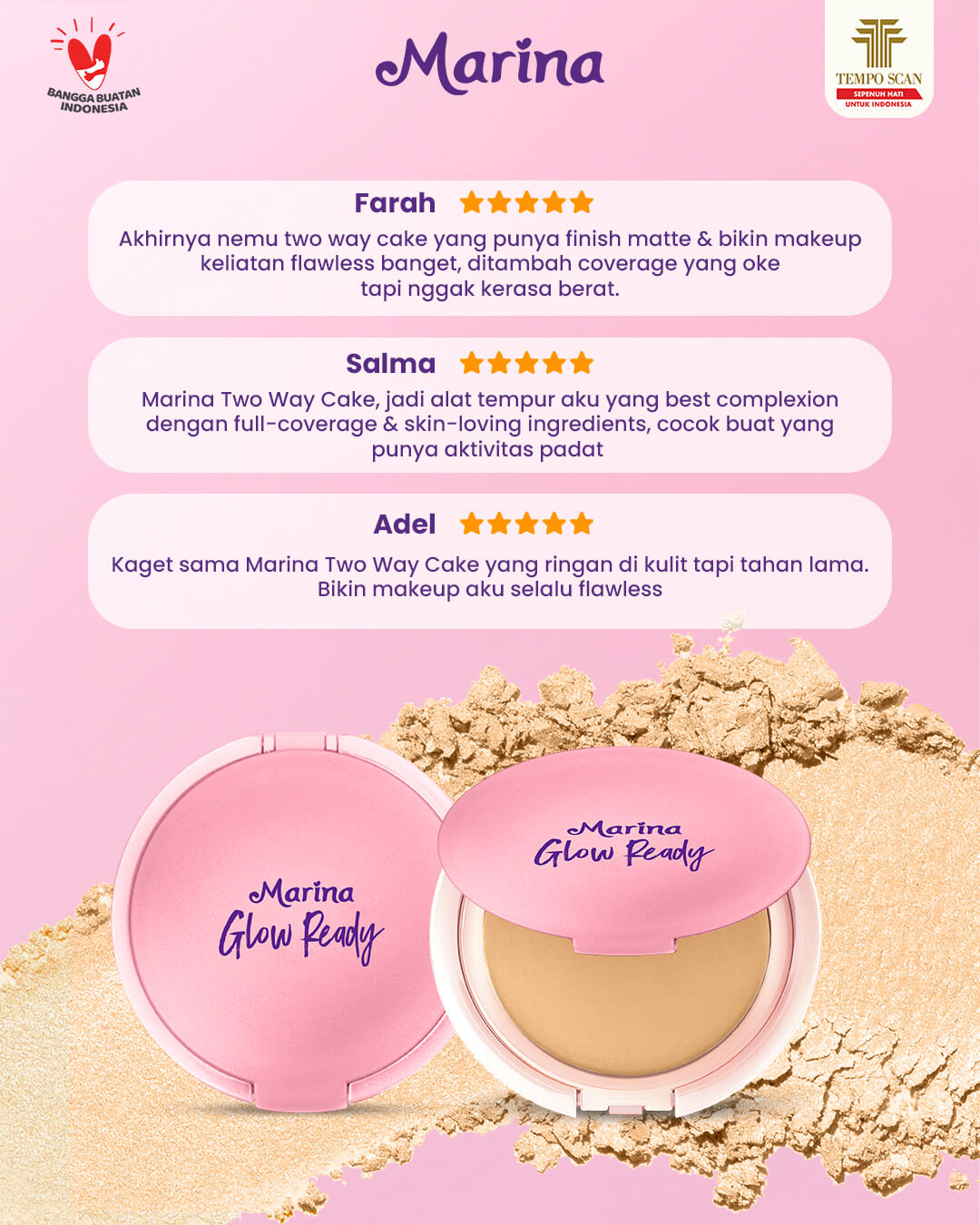 - Formulanya ringan, menempel sempurna, mudah merata, dan menutup noda atau flek hitam di wajah.