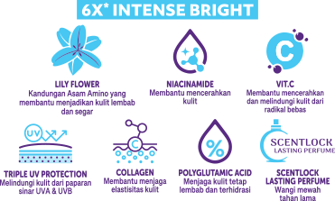 Marina Glow Essence Body Serum, dibuat dengan formula khusus yang ringan, tidak lengket, dan cepat menyerap dengan 6X Intense Bright dari Vit.C, Niacinamide, Triple UV Protection, Collagen, Polyglutamic Acid, dan Scentlock Lasting Perfume. Menjadikan kulit lembut, bersinar, dengan keharuman mewah yang tahan lama.